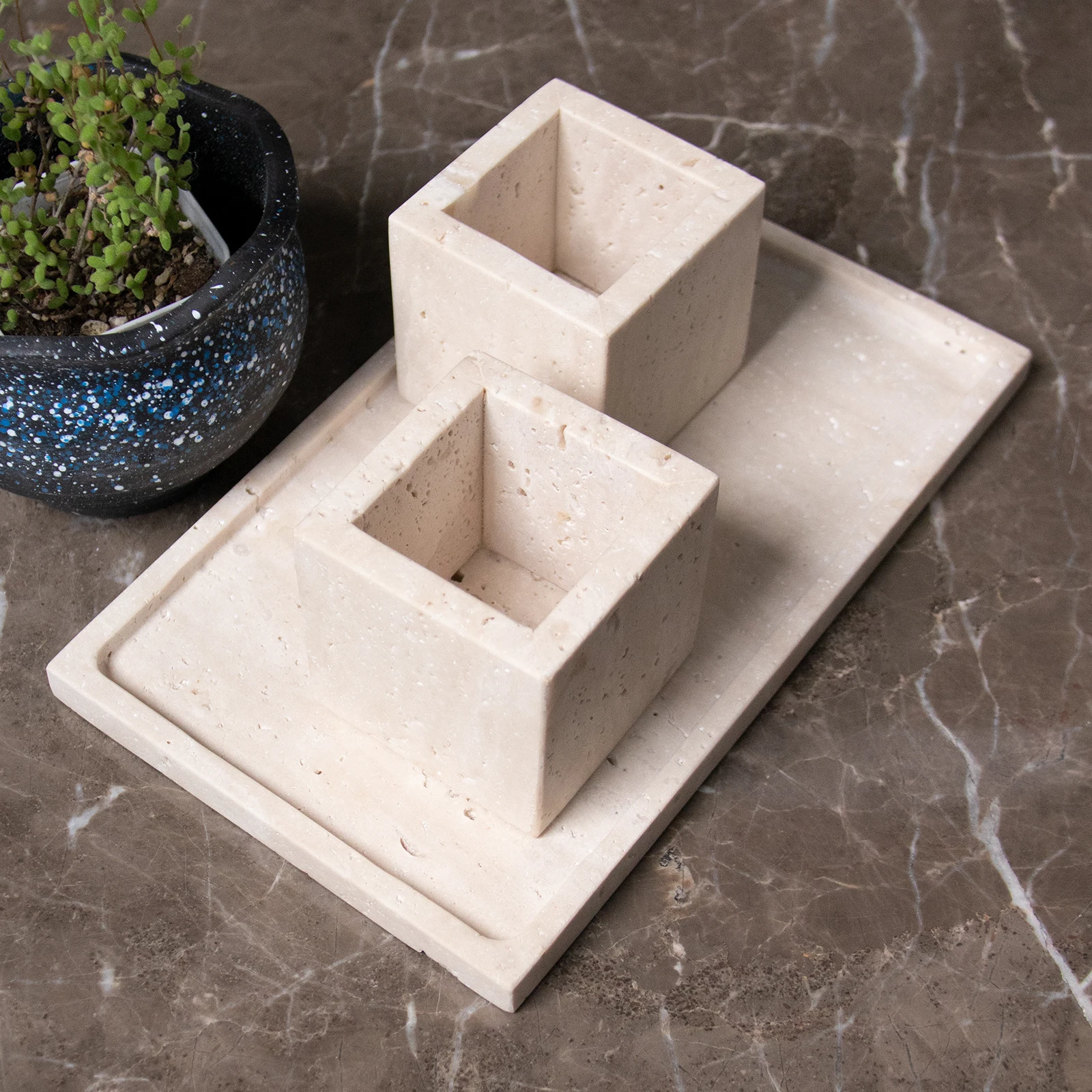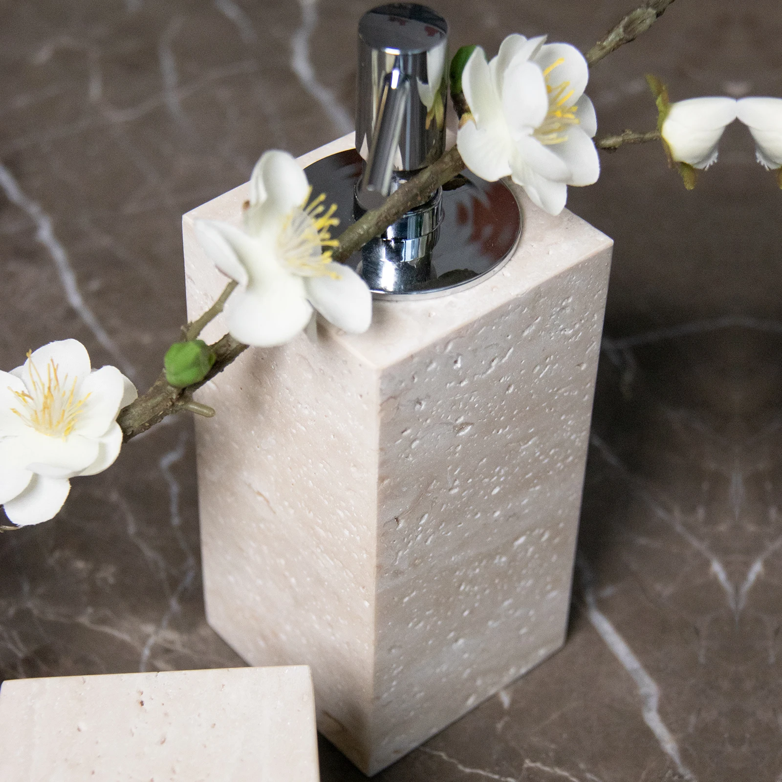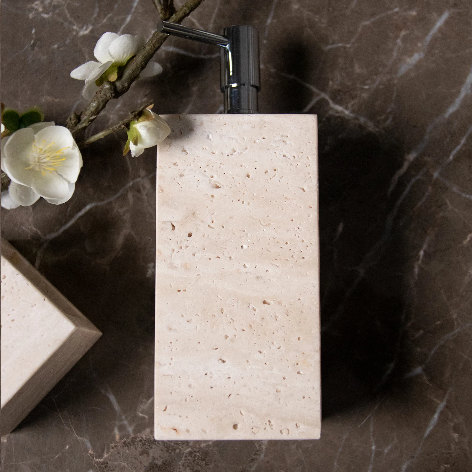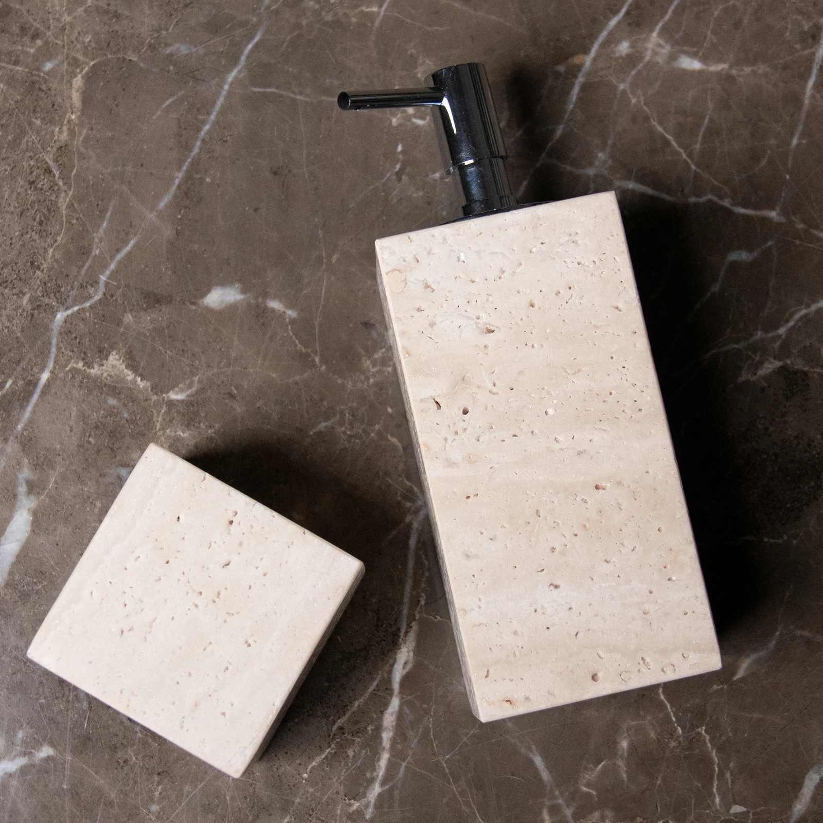 Crafted from premium travertine marble, this set combines durability with a tactile, warm touch. The natural stone resists wear and ages gracefully, developing a unique patina over time that makes every piece one-of-a-kind. Smoothly honed surfaces and softly rounded edges provide a refined finish while remaining practical for everyday use. The understated color palette blends seamlessly with neutral and modern bathrooms, bringing a spa-like feel to your home.