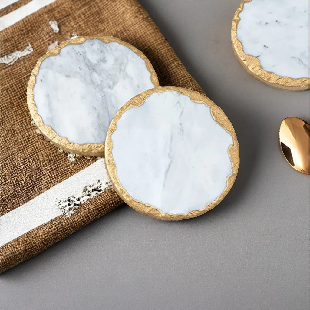 These coasters are designed for practical everyday use as well as special occasions. The dense marble surface resists heat and provides a sturdy base for cups, glasses, mugs, and small decorative items. The polished finish helps protect surfaces from moisture and prevents cold rings, while the gold-trimmed rim creates a clean barrier that helps contain minor spills. Their durable construction means they will maintain their appearance over time, with minimal care required.